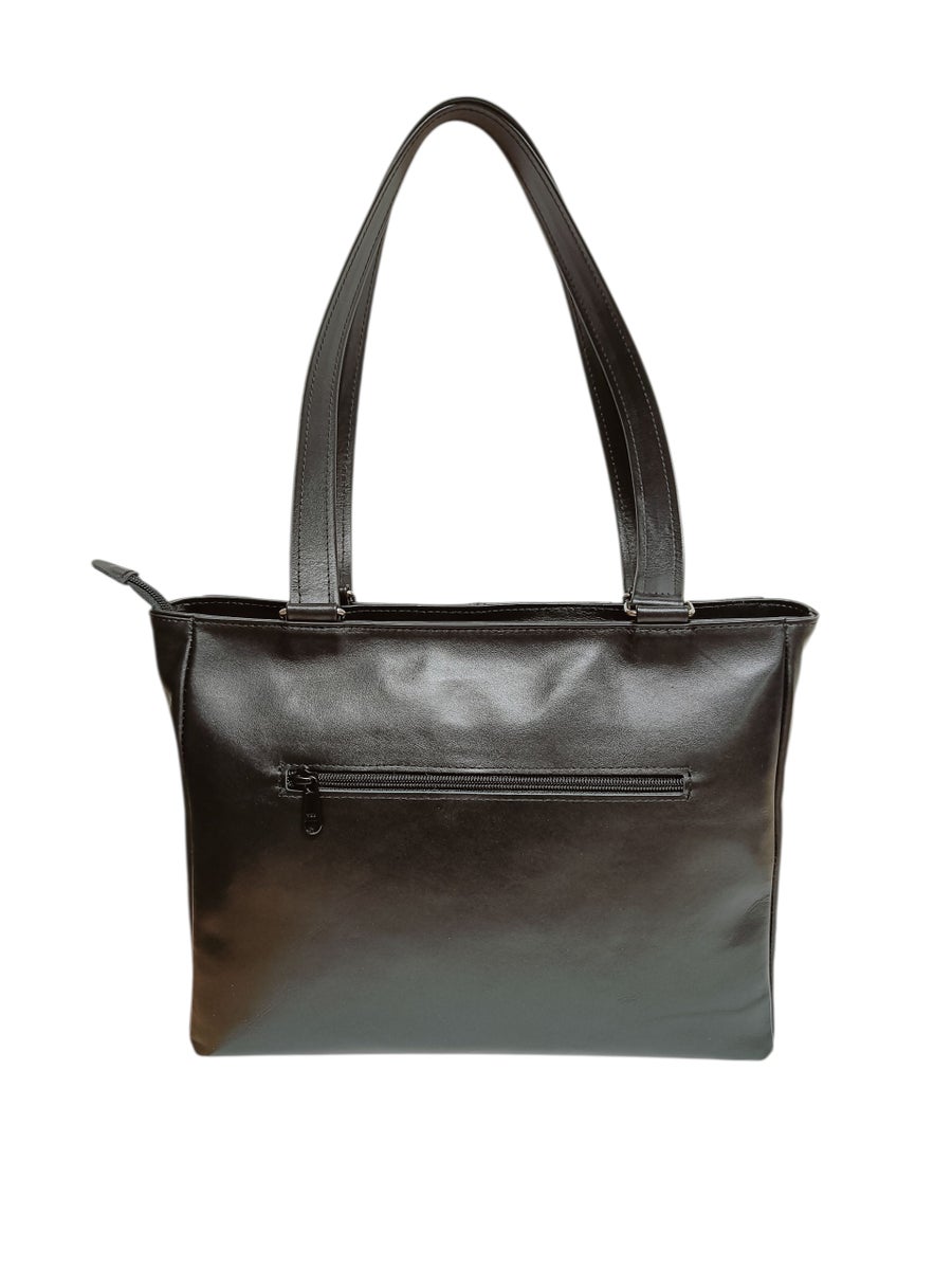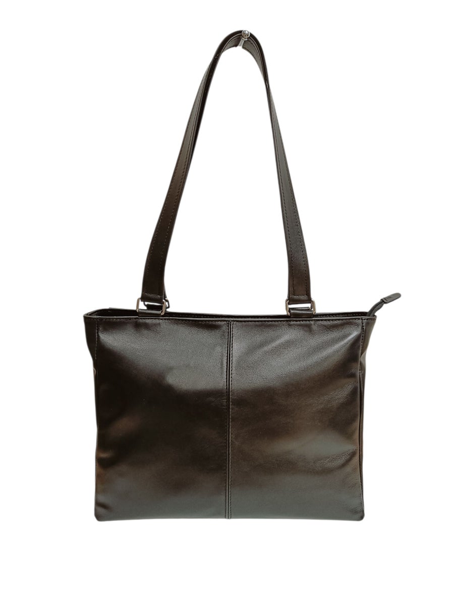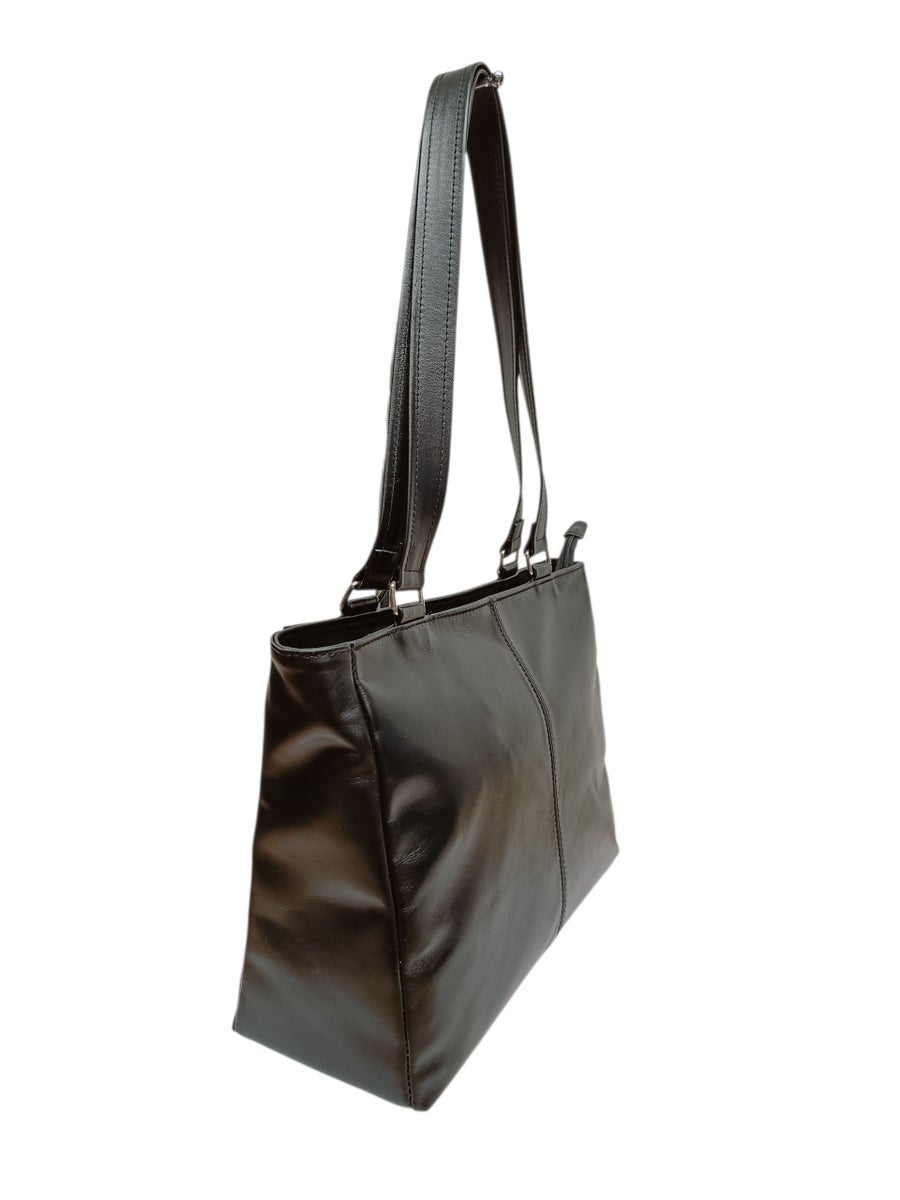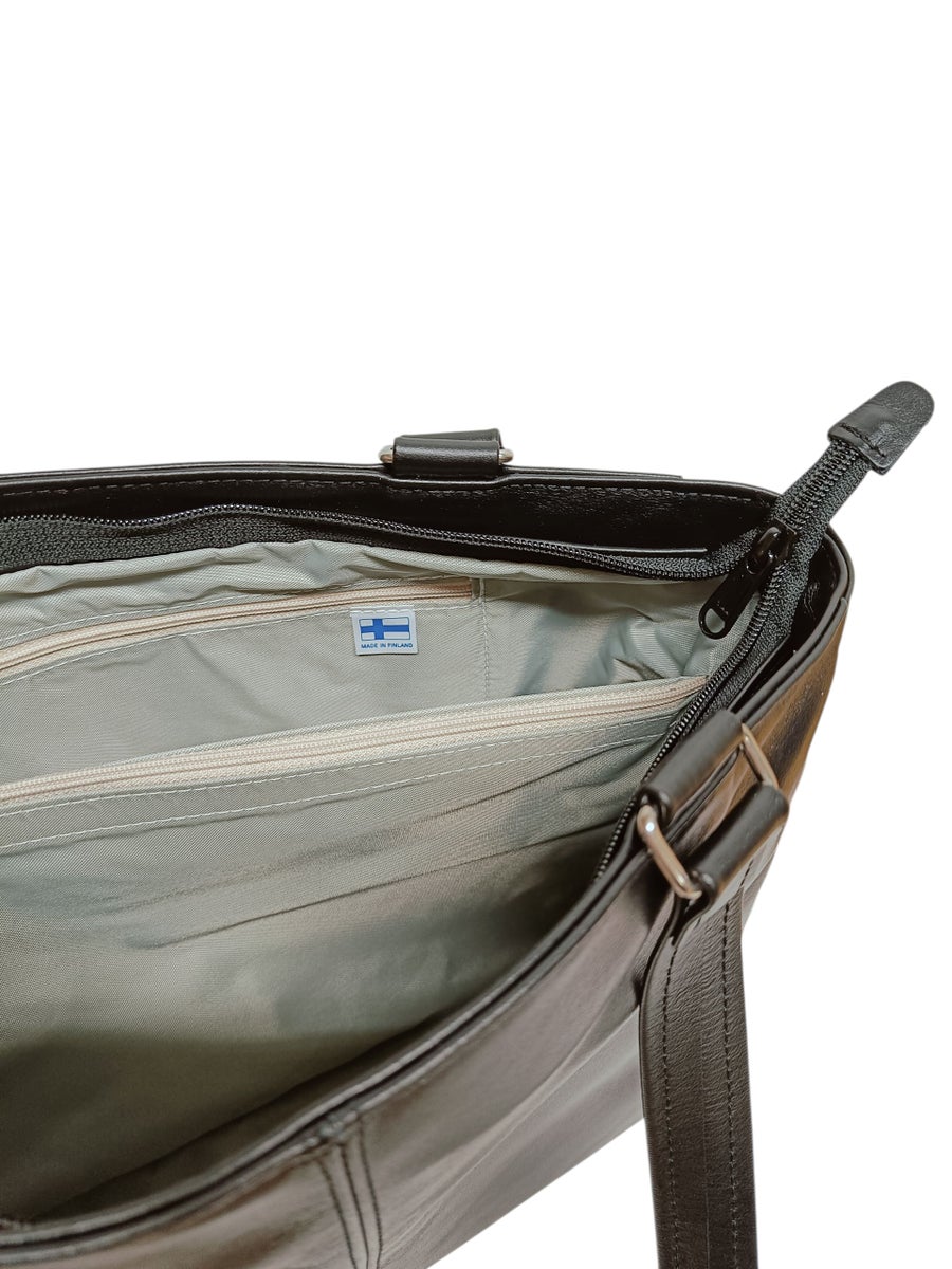 Suomessa valmistettu keskikokoinen olkalaukku aidosta nahasta.