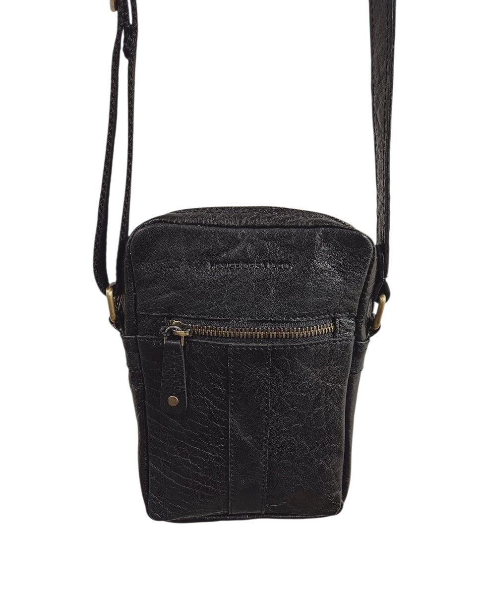 Miesten pieni olkalaukku, joka on valmistettu laadukkaasta aidosta nahasta. Laukun edessä ja takana pienet vetoketjutaskut. Myös sisältä löytyy pikkutasku, muuten laukku on sisältä yhtä avointa tilaa. Tähän mahtuu tärkeimmät eli puhelin, lompakko ja vähän muuta pikkutavaraa.